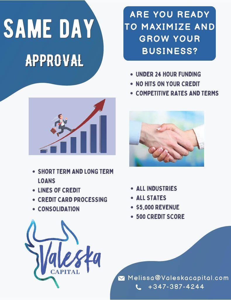 Travailler avec Valeska Capital peut vous ouvrir les portes de nombreuses opportunités pour soutenir votre entreprise. Une fois que vous recevez du financement, nous pouvons vous proposer des produits tels que des marges de crédit, de la consolidation, du financement d'équipement, du traitement des cartes de crédit et plus encore.
